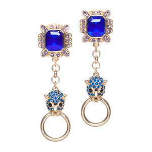 Animal motifs have become a staple that never go out of style. These earrings feature a goldtone leopard's head, studded with blue crystals, sporting an open gold ring in its mouth. The head dangles on a chain from a square cut blue stone set in goldtone metal with embedded crystals. goldtone metal, crystals 2 1/4" long post closure for pierced earrings the link to find this iserikas.kitsylane.com/index.php?file=product_detail&pId=1250