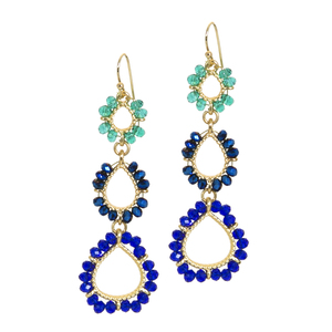 The perfect harmony of classic elegance and striking color unite in these triple drop earrings. Detailed gold is surrounded by faceted beads in light emerald, cerulean and cobalt blue to create a look that is both striking and sophisticated. Gold & beads 2 1/4" long French wireerikas.kitsylane.com/index.php?file=product_detail&pId=1730