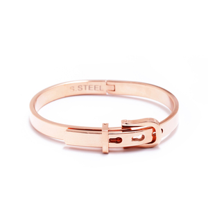 Increase your arm charm with this refreshingly original bangle. Crafted from polished rose gold and featuring a buckle, this bangle looks great with jeans, a pencil skirt or a dress. It's truly wrist bliss Rose gold tone metal 1/4" wide Adjustable size Hinge closure erikas.kitsylane.com/index.php?file=product_detail&pId=1720