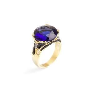 Flaunt your fingers with this fabulous ring. A large faceted blue sapphire sits up high in a decorative setting that is encrusted with Swarovski crystals in jet and white. Gold plate, swarovski crystals, genuine blue sapphire 2/3" diameter Sizes 5 to 9 erikas.kitsylane.com/index.php?file=product_detail&pId=1699